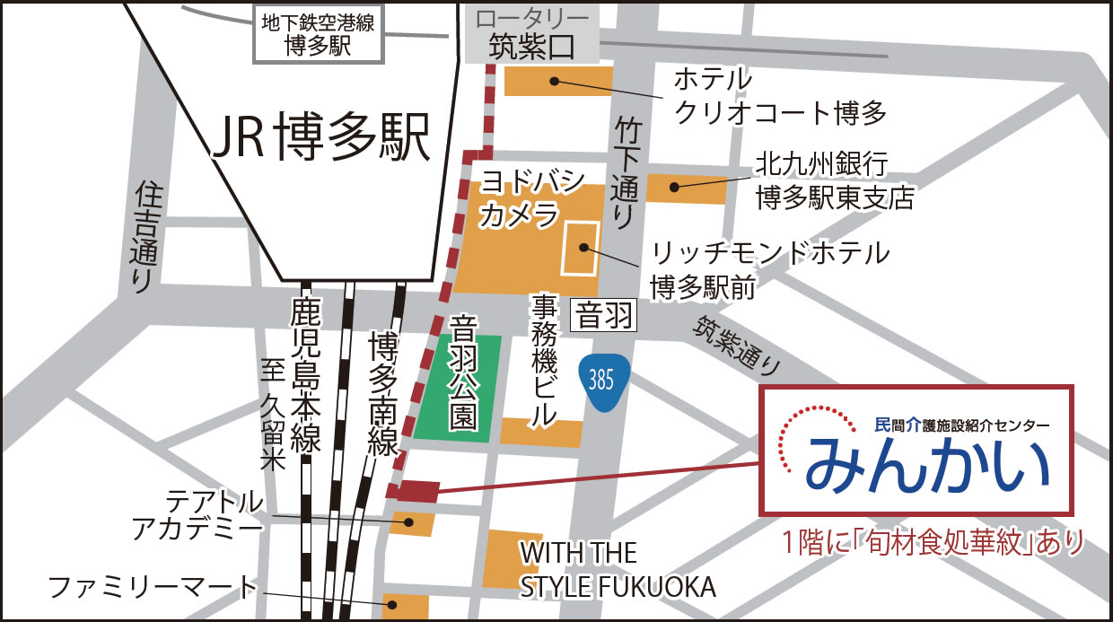福岡博多相談室は、博多駅南1丁目です。「博多駅」筑紫口から徒歩6分、「音羽公園」を抜けたところにあります。また、訪問面談(相談員がご指定の場所へ伺う)を積極的に行っており、福岡市内はもちろん、糟屋郡、福津市、糸島市、筑紫野市の範囲までの、ご自宅や病院、施設などにもお伺いしております。